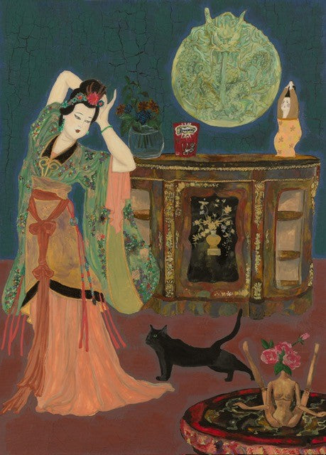 She stretches. The cat copies her.